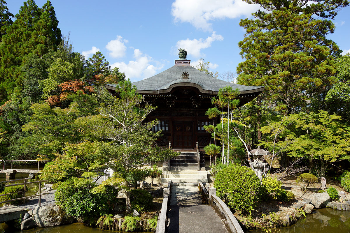 | 本堂の裏から用意されているスリッパを履いて渡り廊下へ出ます。本堂の裏は庭園の様になっており、放生池の向こう側には弁天堂(摩尼殿)があります。 |