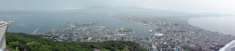 | 山頂に着くと霧はすっかり晴れていて、良くテレビ等で見る半島のくびれも綺麗に見えています。正面には2日前の朝、ホームに降りた函館駅や、これから向う五稜郭タワーが良く見えます。遠くの景色はまだ霧がかかっている様で、良く見えなかったのは残念です。本当は昨夜もこの場所から夜景を見たかったのですが、霧がかかっていたので来ることを断念しました。函館へ来た最大の目的がここからに夜景だったのでとても残念でした。ここもまた来なくてはなりません。 | ||