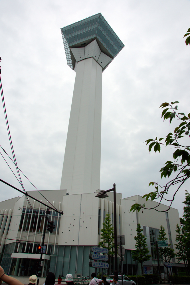 | 展望台の窓は傾斜が付いていて、窓際に立つと真下を見ることが出来ます。高度感は凄く、高い所が苦手な人にはお勧めできない景色です。展望台からは市内をはじめ海や周りの山々も見える筈ですが、霧が出始めてしまい余り見えません。特に函館山は全く見えなくなってしまいました。一番最初に行っておいて正解でした。 下りのエレベーターは2階までで、そこから1階のアナトリウムに階段で降りることになります。ここでソフトクリームを食べながら一休みをして駐車場へ向いました。降り出してきたかと思った雨も、それ程強くならずに止んだようで助かりました。車に戻り、ガソリンスタンドで満タンにし、レンタカーを返して旅は終了しました。 | ||