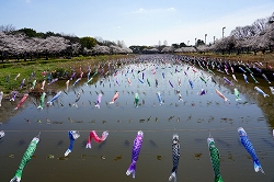 以前から気になっていた館林の「こいのぼりの里まつり」、桜満開の時に行って来ました。この祭りでは館林市内5ヶ所に、4000匹以上のこいのぼりが掲揚されます。特に今回行った鶴生田川会場は、ここだけで約3000匹を掲揚する最大の規模です。市役所近くの鶴生田川では、佐野行田線の五号橋からふれあい橋の少し下流まで約700mの間で掲揚しています。特に二の丸橋から下流は川幅が広くなっているので見応えは十分あります。三の丸南面駐車場から左岸を五号橋まで行き、今度は反対側の右岸をふれあい橋まで行って、左岸を駐車場まで戻れば約1.5Kmで丁度良い散歩になります。 またこの時期は「館林さくらまつり」も同時開催されています。鶴生田川の両岸は桜並木で、満開の桜とこいのぼりのコラボレーションは圧巻の景色でとても綺麗でした。 |