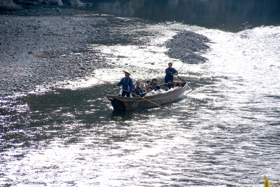 最初に一番の見所、岩畳に行きました。9時少し過ぎ、すぐ近くの有料駐車場(無人で500円を箱に入れる)に止めましたが、ガラガラで、帰るまで車を止めたのは私の車1台のみでした。みんな他の所に止めてるのかな。結晶片岩の岩畳と対岸の秩父赤壁は迫力があり、所々に見える紅葉と時々横切るライン下りには風情を感じます。岩畳の上には砂が沢山上がっていましたが、これは台風の時に川が増水し残していった物のようです。雨が降るたびに少しずつ流れ、夏ごろには綺麗になるらしいです。ちかくで説明していたお土産屋の関係者らしき人が言っていました。