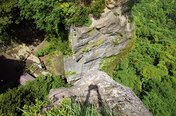 ここから少し戻り長い階段を息を切らしながら登ると山頂展望台で、その一角に地獄のぞきがあります。GW中などは覗くのに順番待ちする事もある様ですが、この日は空いていてゆっくり覗くことが出来ました。確かに突き出している岩の上なので高度感はありますが、恐怖感は特に感じませんでした。多分登山で高い所に登り慣れているからだと思います。でもさすがに眺めは文句無しです。