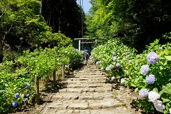 謙信平からの帰りはあじさい坂ではなく、山の中の遊歩道を歩きます。紫陽花が咲いているかなと思ったのですが、何もなくただの山道といった感じです。最後にある女坂の石段付近では少し紫陽花が咲いていました。最後はあじさい坂入口にある六角堂を参拝し、ご朱印を頂いて帰りました。 |