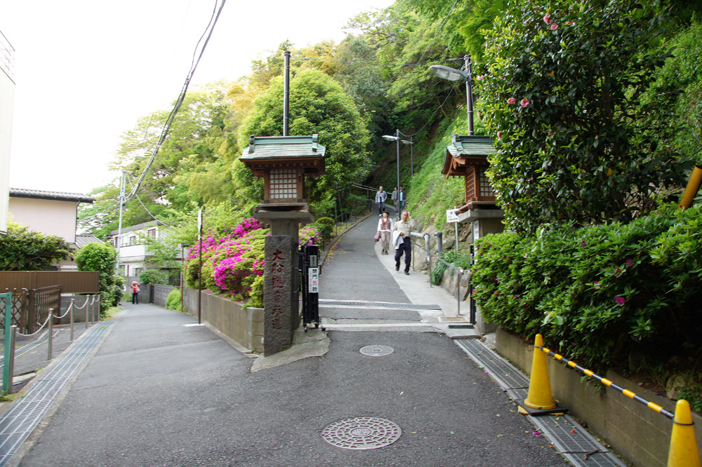 大船観音を少しはなれた所から見ると、小高い山の上に観音像の頭だけが見えます。参道入口から坂道を少し登ると、入口の観音寺山門があり参拝料として300円をここで払います。