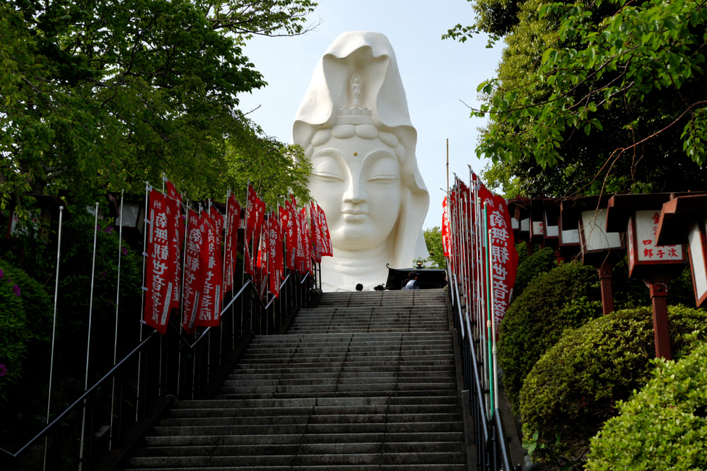 山門から入ると正面奥に原爆慰霊碑があります。そちらには行かずすぐ右に折れると長い階段があり、その先には観音像の大きな顔が現れます。長い階段を登りきると、いよいよ大船観音像(白衣観音)は目の前です。遠くから見た感じでは大きな観音像が立っているイメージですが、実際は上半身だけの胸像です。その大きさは高さ25m、巾19m、奥行13mという巨大さです。普通の立っている観音像ではこのサイズになると近くで顔を見ることは出来ませんが、ここでは間近に見る事が出来るので迫力があります。