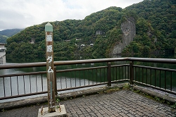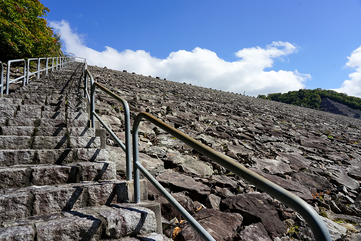| 【奈良俣ダム】 型式:ロックフィルダム、堤体積:13,100,000m3、堤高:158m、堤頂長:520m 総貯水容量:90,000,000m3、有効貯水容量:85,000,000m3 矢木沢ダムから県道に戻って更に奥に入り、カーブを曲がると突然目の前に石を積み重ねたロックフィルの奈良俣ダムが現れます。この型式のダムは土や岩石を積み上げて造られており、体積が大きくロック部分の傾斜は緩やかになっています。 奈良俣ダムはこのロック部分に遊歩道が設置されており、下流の発電所から天端まで上がる事が出来ます。当初は下に車を止めて上がろうと思っていたのですが、駐車スペースが少なく止められなかったので最初に天端まで行く事にしました。ここは県道からも近く変わった形のダムな為か、多くの観光客がいました。大きなならまた湖と尾瀬の山々が間近に迫り、とてもきれいな景色です。長い天端を右岸まで渡り、そこから遊歩道を下って発電所まで往復します。高低差は158mあり上から見ると遥か下まで続いている感じで、下り始めは驚くほど急な傾斜です。ここを戻って来なければならないのかと思うと、憂鬱になります。下りはのんびり歩いて20分で発電所まで行けました。下で少しウロウロした後、天端まで戻ります。最初は傾斜が緩やかな階段ですが、徐々にその傾斜は増していきます。下から見上げるロックは、上から見た感じとは違い大迫力です。途中に休憩場所があり、そこから先が一番大変な急登の階段となります。見上げると嫌になるほど階段が続いているので、足元や横を見ながら一歩一歩ゆっくり上って行きます。上り始めて約25分、やっと天端に到着しました。ゆっくり上ったお陰で、息は切れましたが思った程疲れた感じはありませんでした。 天端でふとダム湖の方を見ると、その向こうには雲の隙間から笠ヶ岳が見えていました。この山は3年前に登っており、山頂からはこのならまた湖が良く見えていました。 |