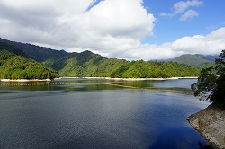 | 【矢木沢ダム】 型式:アーチ式コンクリートダム、堤体積:510,000m3、堤高:131m、堤頂長:352m 総貯水容量:204,300,000m3、有効貯水容量:175,800,000m3 須田貝ダムのダム湖は洞元湖で、その脇道を8Km程走ると矢木沢ダムに着きます。型式はアーチ式コンクリートダムで、今回巡ったダムに中では一番の貯水量です。ここもダムの下までは行けませんが、下流の矢木沢橋からダム正面の一部を見る事が出来ます。個人的には重力式ダムのドンと構えた形より、アーチ式ダムの美しい曲線が優雅で好きです。ダム湖の奥利根湖は非常に大きく綺麗です。矢木沢ダムは県道から約9Km奥まで入らなくてはならない為か、有名な割には観光客は少なかったです。 |