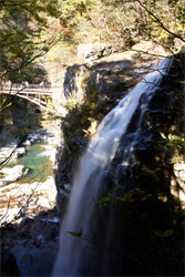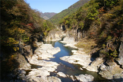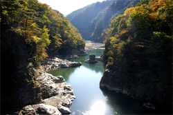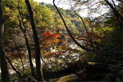 駐車場の下にある虹見橋付近の色付きはイマイチです。所々綺麗に赤くなっている木もありますが、もう少しでした。むささび橋の少し上流にある大観付近まで行くと、色付いた木も多くなってきす。龍王峡から車で少し走った五十里ダムや川治ダムではまわりの山は綺麗な色をしていました。