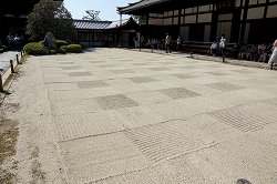 | 方丈正面の南庭は210坪(693平方メートル)ある枯山水庭園です。東西に細長い地割に蓬莢・方丈・瀛洲(えいじゅう)、壺梁(こうりょう)の四島に見立てた巨石と、砂紋による荒海の表現に加え西方に五山を築山として大和絵風にあらわし神仙境を表現しています。 |